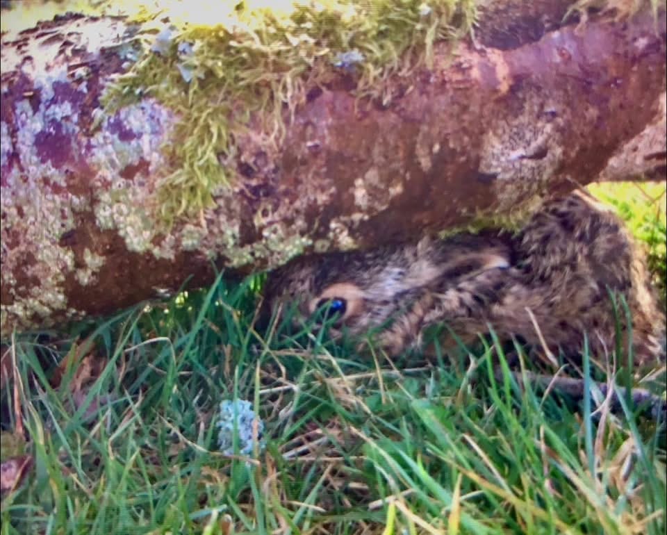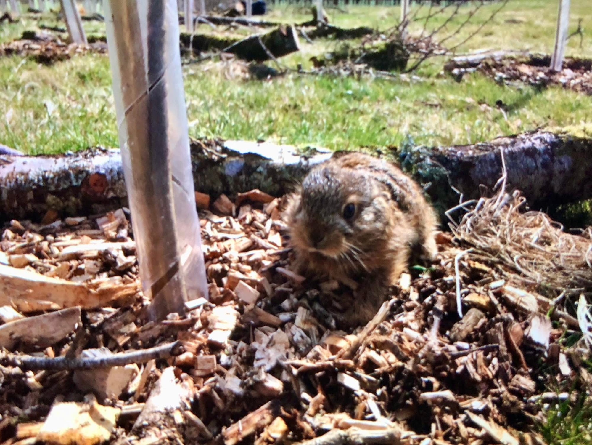 A few days ago, Oz was doing some mulching and spotted a leveret. Hares love grassland and hedges and woodland edges so it is no surprise that we have spotted them several times here at Rhuddin. Hares do not live in burrows like rabbits and the leverets are born with full fur and sight, ready for survival. They shelter in little ‘forms’ or dips in the ground where they lie flat so as to not be discovered. A new leveret’s strong survival instinct is to freeze if they sense danger from a predator, trusting in their good camouflage, pressed down close to the ground. This is exactly what the leveret was up to when Oz first spotted him, tucked away under a log near the newly planted trees. A dear little creature indeed who, once he realised he had been spied, growled like a gremlin and went into boxing mode when Oz came too close! Since hares love to graze on the bark of young trees and bushes, I was thankful that the little trees were secured away in their guards for now, away from the furry nibblers.