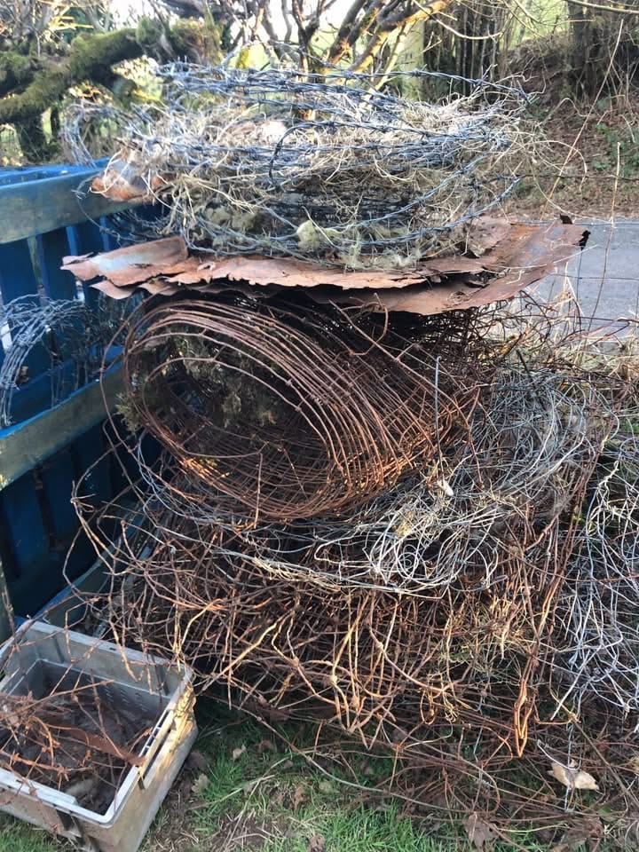 We went on to another satisfying job: pulling out more rusty stock fencing from the old grown out hedge. Layers of abandoned fencing showed the sheep grazing history of the fields. Two of us heaved at posts and barbed wire and rusty fence that over the years had been left and replaced and was now half engulfed by the land. With one of us snipping the posts free and another carefully folding up and stomping down the rusty metal wires into a manageable roll , it was satisfying to lift it up and away, another gentle whisper of a new chapter for the fields here. I imagined that the land softened and sighed with relief but I think it was more the welcome idea of us being able to amble barefoot without coming a cropper.